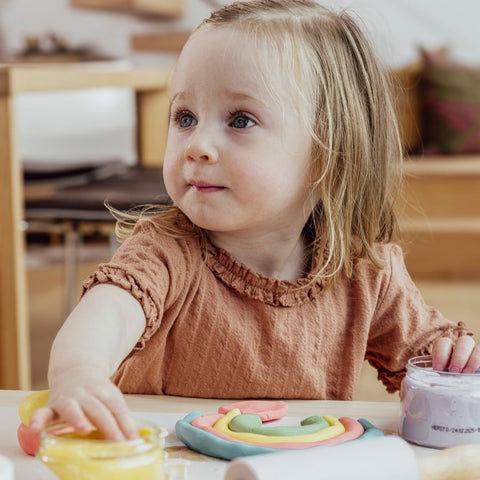 Unsere kindersichere, vegane Knete ist perfekt für sensorisches Spielen und eignet sich wunderbar als Montessori Spielzeug, das vegan ist. Sie begleitet dein Kind beim Entdecken, Lernen und Wachsen.